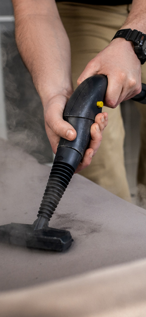 Koristimo profesionalni stroj za dubinsko čišćenje kauča. Ekstraktor koji u jednom potezu raspršuje vodu i sredstvo duboko u tkaninu, razgrađuje nečistoće i istovremeno ih usisava.